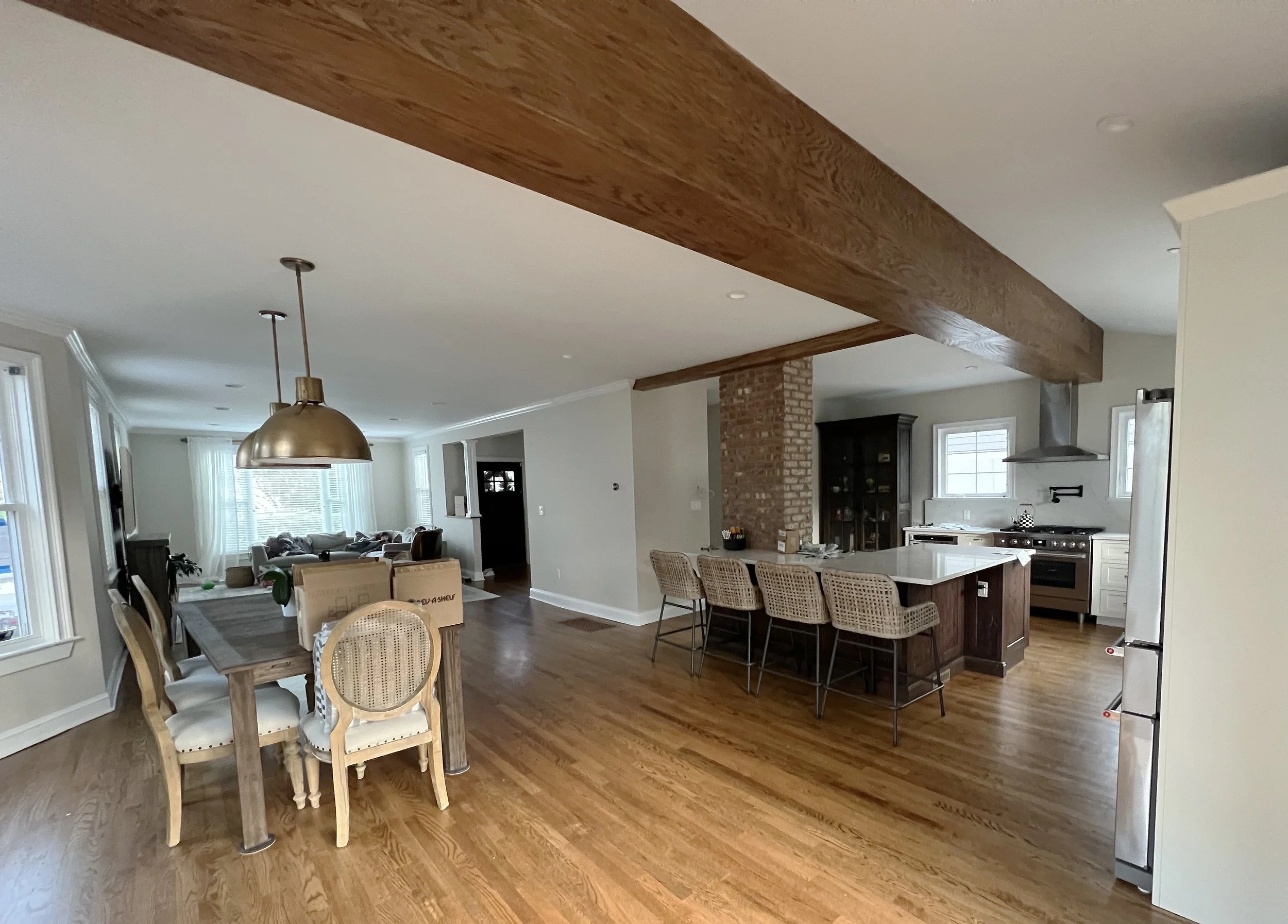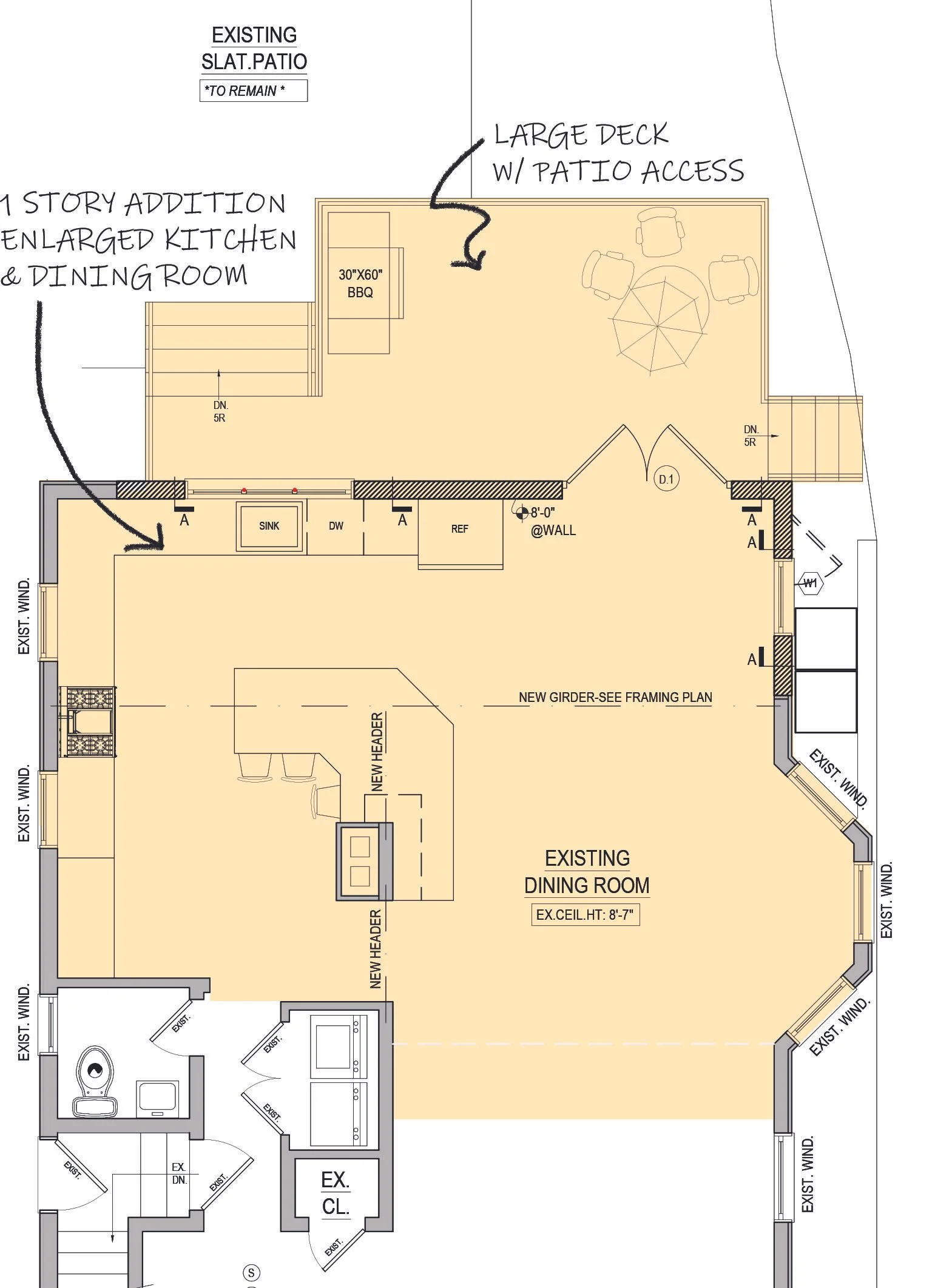 1 story addition to enlarge kitchen and create open floor plan with dining room. remove existing wood deck and proposed a new larger deck at single family dwelling